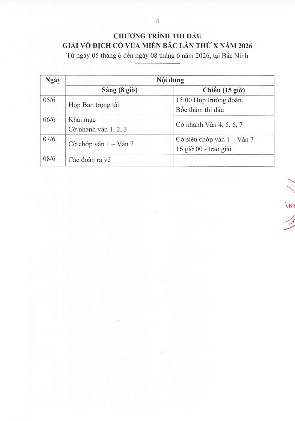 | 05/6 | Họp Ban trọng tài | Họp trưởng đoàn, bốc thăm |